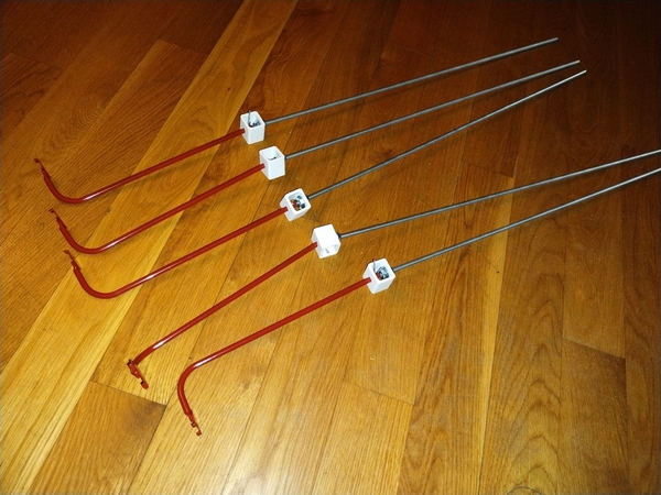 Here’s what the assembled, extended hangars look like. 1/4-20 threaded rod is very similar in diameter to the hangar, so that’s what I used. The monorail hangars are held in place by a washer and cotter pin. In theory, having a longer rod would allow you to use any of the hangars– even the short ones from the crossover set– but later on my decision to use mix-and-match hangars would introduce new challenges.