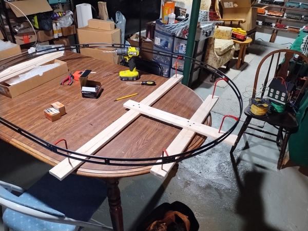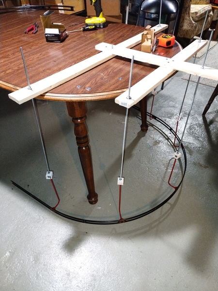 I decided that lining up the curved sections in situ on the ceiling would be too difficult, so I built frames and predrilled the holes for them. Here’s what the corner section looked like when I tested the fitment. Note that the diameter of the track is around 42-43″, but unlike regular tubular track, the radius is held in compression when fully assembled.