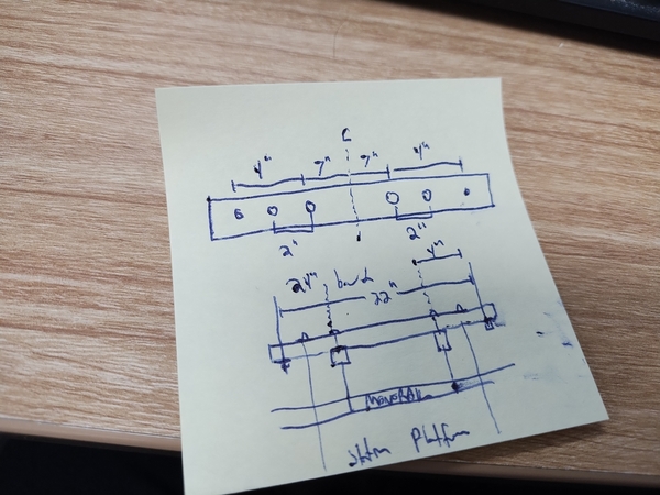 The two sections in question were problematic because the top of the threaded rod was centered on doubled-up joists. I sketched out an idea for a solution using some of the 1×3 scraps leftover from the project. I needed to add a couple extra inches so I could straddle the joists.
