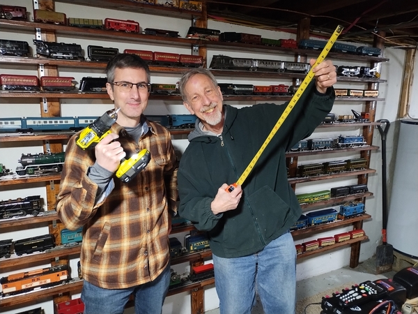 Preassembling sections took a week and a half’s worth of evenings, but the REAL work was hanging them all up. Working over the existing layout was a challenge, as was getting and then KEEPING everything as straight and even as possible. We spent a LOT of time sighting down the sides of the monorail track as we worked, tapping and prying to get things close to true.